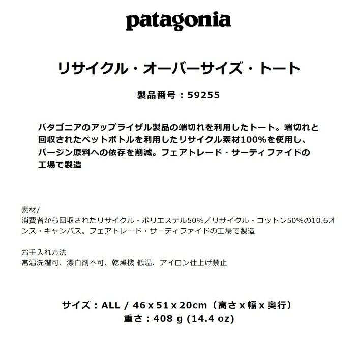 patagonia パタゴニア リサイクル・オーバーサイズ・トート 59255 UFTN 内ポケット コットン ポリエステル 10.6オンス 肩掛け 大容量 エコバッグ ロゴ 正規品