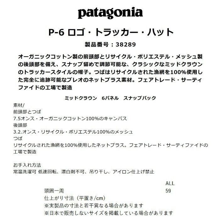 patagonia パタゴニア P-6 ロゴ・トラッカー・ハット 38289 キャップ ミッドクラウン 6パネル スナップバック オーガニックコットン メッシュ ロゴ 正規品