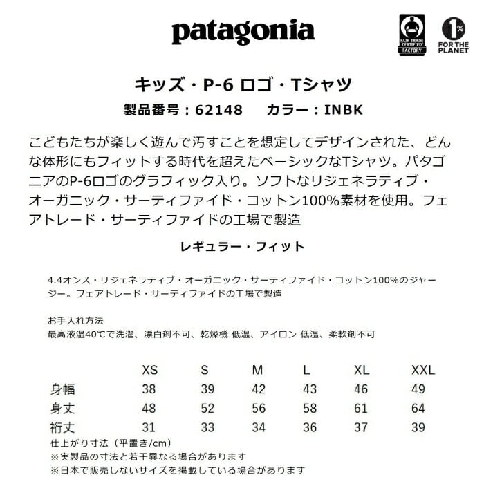 patagonia パタゴニア キッズ・P-6 ロゴ・Tシャツ 62148 INBK レギュラーフィット 半袖 オーガニック コットン 4.4オンス ソフトタッチ XS-XXL ロゴ 正規品