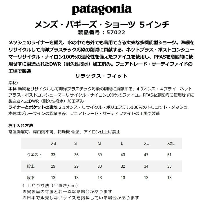patagonia メンズ・バギーズ・ショーツ 5インチ 57022 リラックスフィット 多機能型 メッシュライナー 速乾 撥水加工 ドローコード ロゴ パタゴニア 正規品