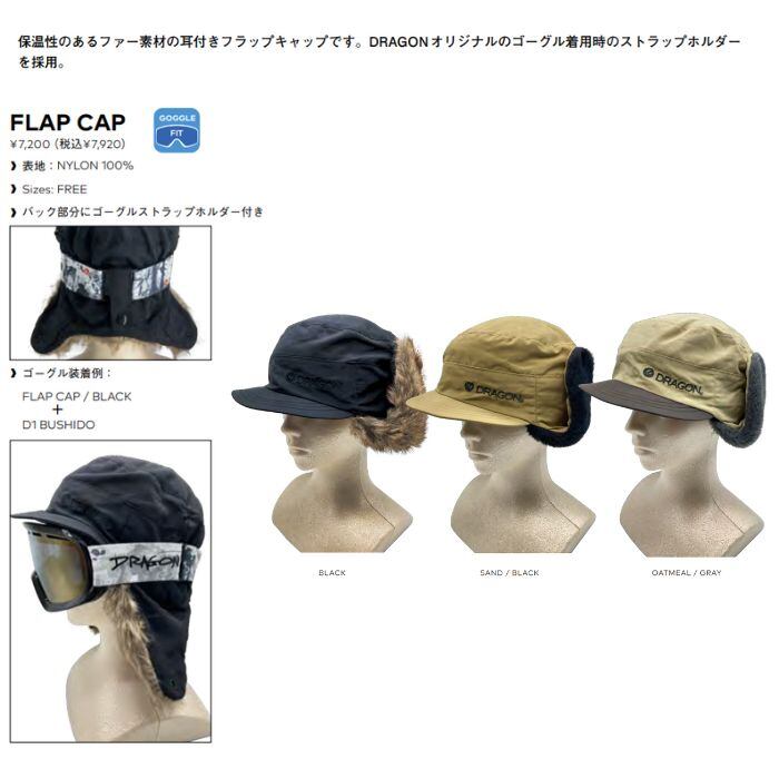 23-24 DRAGON ドラゴン FLAP CAP SAND / BLACK フラップキャップ ゴーグルストラップホルダー付き 帽子 ロゴ 正規品