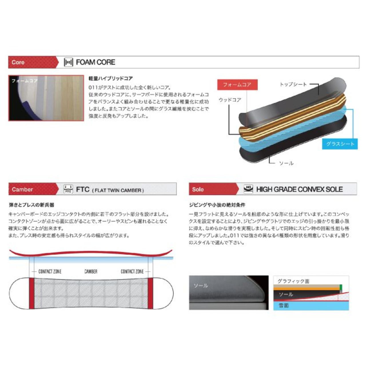 ソフトフレックス&トーションバランスで全てのユーザーを虜にする操作性は011の歴史です。芯材を超軽量フォームコア(サーフボードに使われている素材)にすることで最軽量化に成功しました。ソフトなトーション(ねじれ)でスタイルを出し、全くクセが無く弾けるDOUBLE FLYでゲレンデを自由に操れます。