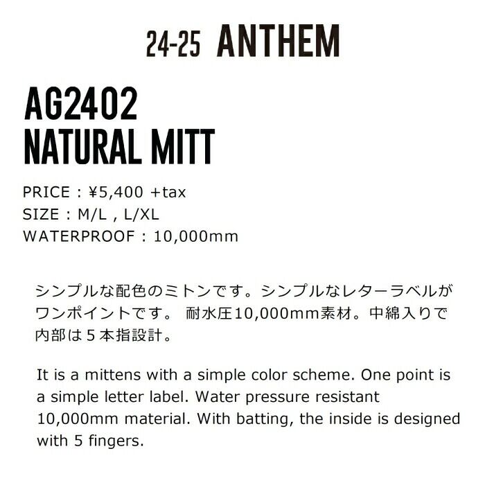 24-25 ANTHEM NATURAL MITT AG2402 スノーミトン ROSY BROWN 中綿入り 耐水圧10,000mm 内部5本指仕様 リーシュ ロゴ M/L L/XL グローブ スノーボード 正規品