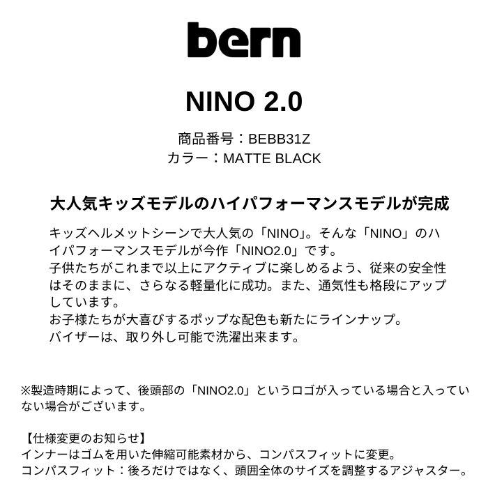 BERN バーン NINO 2.0 ヘルメット BEBB31Z MATTE BLACK 子供用 US FIT スケートボード スノーボード 正規品