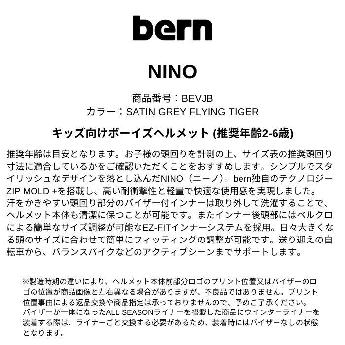 BERN バーン NINO ヘルメット BEVJB SATIN GREY FLYING TIGER 子供用 US FIT スケートボード スノーボード 正規品
