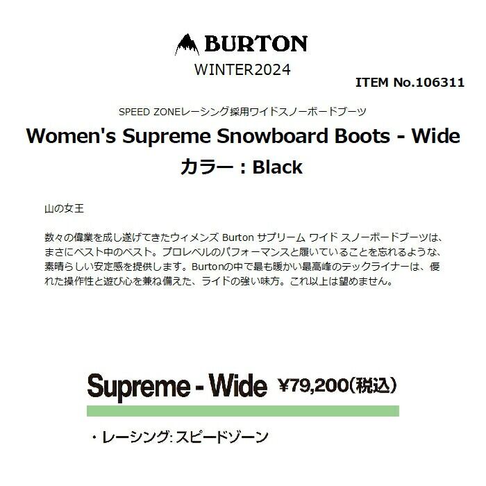 BURTON バートン Women'sSupreme SnowboardBoots-Wide 106311 スノーボードブーツ スピードゾーン ハード オールマウンテン バックカントリー レディース 正規品