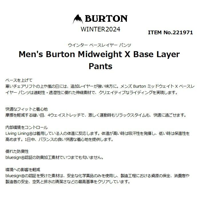 BURTON バートン Men's Burton Midweight X Base Layer Pants 221971 ベースレイヤー スリムフィット 4WAYストレッチ 防臭加工 速乾 透湿 腿ポケット 正規品