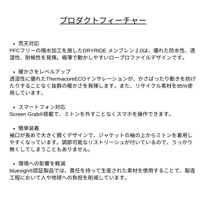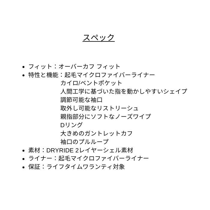 ・特性と機能:起毛マイクロファイバーライナー、カイロ/ベントポケット、人間工学に基づいた指を動かしやすいシェイプ、調節可能な袖口、取外し可能なリストリーシュ、親指部分にソフトなノーズワイプ、Dリング、大きめのガントレットカフ、袖口のプルループ