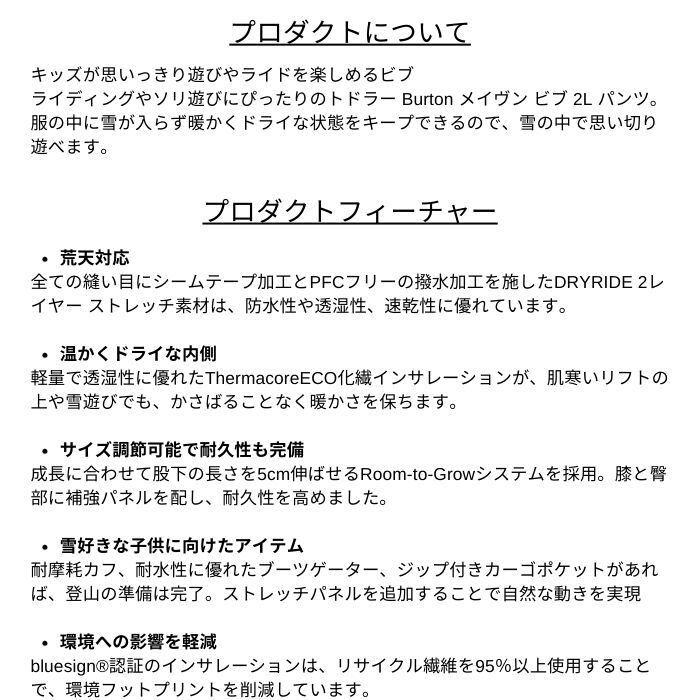 ライディングやソリ遊びにぴったりのトドラー Burton メイヴン ビブ 2L パンツ。服の中に雪が入らず暖かくドライな状態をキープできるので、雪の中で思い切り遊べます。