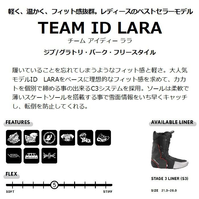 商品説明 履いていることを忘れてしまうようなフィット感と軽さ。大人気モデルID LARAをベースに理想的なフィット感を求めて、カカトを個別で締める事の出来るC3システムを採用。ソールは柔軟で薄いスケートソールを搭載する事で雪面情報をいち早くキャッチし、転倒を防止してくれる。