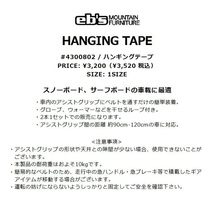 eb's エビス HANGING TAPE 4300802 ハンギング テープ 2本セット 車載用バンド 簡単装着 ループ付き 耐荷重約10kg 車内収納 スノーボード サーフボード 正規品