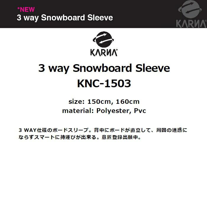 メーカー希望小売価格はメーカーカタログに基づいて掲載しています商品説明モデル名KARNA3 way Snowboard Sleeve定価:5910+(税)サイズ150cm , 160cmモデルKNC-1503概要3 WAY仕様のボードスリーブ。背中にボードが直立して、周囲の迷惑にならずスマートに持運びが出来る。意匠登録出願中。素材Polyester, Pvc※注意事項●返品について●お客様都合によるご注文後の返品・キャンセル・交換は一切受け付けておりませんので、予めご了承下さい。●商品画像について●撮影状況、PC状況により、色合いが若干異なる場合がありますので、ご了承の上ご購入ください。●商品欠品について●掲載されている全ての商品は実店舗・他のネットショッピングでも販売しております。ご注文を承り次第在庫を確保しますが、完売の際はご容赦下さい。 ●送料について●北海道・沖縄・離島等の場合、別途送料が必要となります。