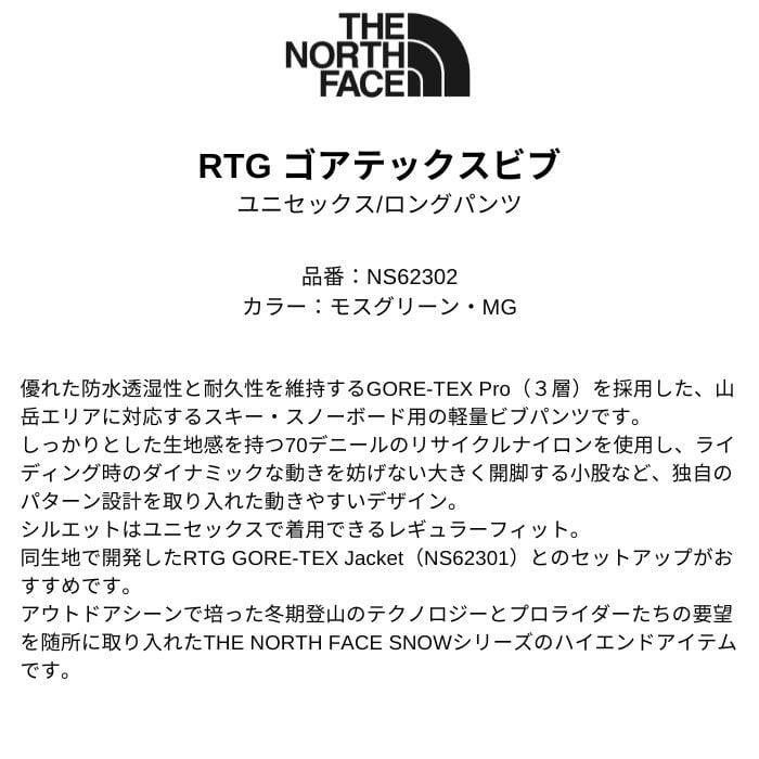 THE NORTH FACE ノースフェース RTG ゴアテックスビブ NS62302 モスグリーン・MG ユニセックス ロングパンツ レギュラーフィット スノーボード ウェア 正規品
