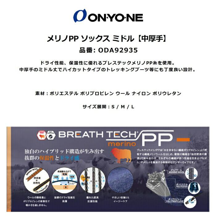 ONYONE オンヨネ メリノPP ソックス ミドル 中厚手 ODA92935 22-28.5cm ブレステックメリノPP糸 保温 ドライ ウインタースポーツ クォーター丈 ロゴ 正規品