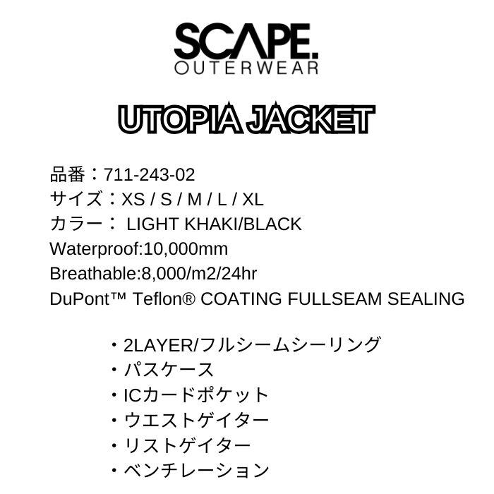 24-25 SCAPE エスケープ UTOPIA JACKET 711-243-02 LIGHT KHAKI/BLACK スノージャケット ウェア 耐水圧10000mm 2LAYER 正規品