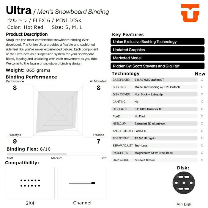 24-25 UNION ユニオン ULTRA ウルトラ Hot Red ミニディスク ミディアムソフト フリースタイル オールラウンド スノーボード メンズ バインディング 2025 正規品