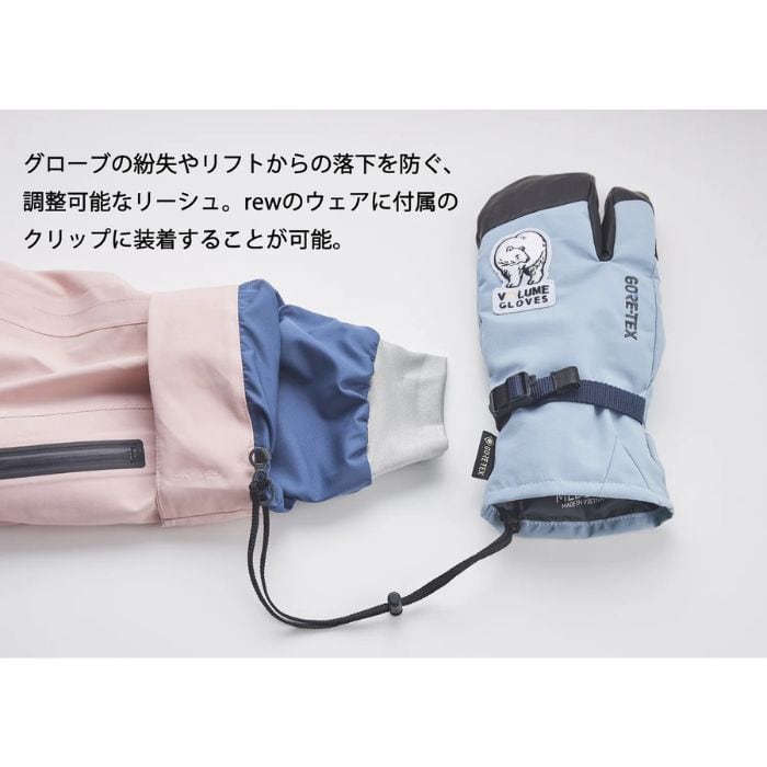 ・グローブの紛失やリフトからの落下を防ぐ、調整可能なリーシュ。rew のウェアに付属のクリップに装着することが可能。