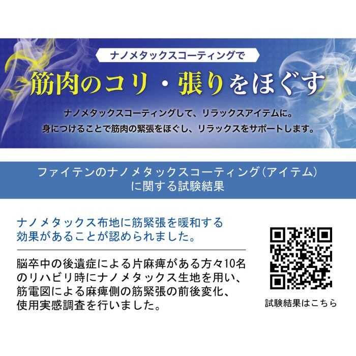 この商品には「ナノメタックス」を採用しており、この技術を用いた商品を身に着けることでカラダをリラックス状態へとサポートします。
