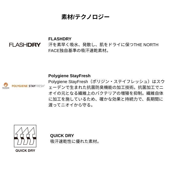 素材は、高い吸汗速乾性をもったTHE NORTH FACE独自の「FLASHDRY」を採用。さらりとした肌当りがいいフィラメント繊維を使用し、味わいのある杢調の表面感にデザインしています。快適さを高める機能として、UVケア(UPF15-30、紫外線カット率85%以上)や、銀イオンによるポリジン・ステイフレッシュ加工の抗菌防臭性を装備。