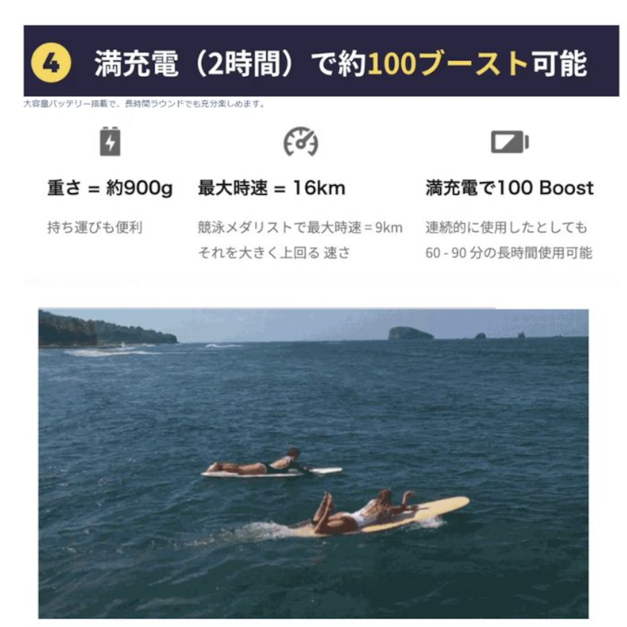 Boost Fin Plusは、手元のボタン一つで、最大時速 = 約16km を繰り出せる電動モーター付きの最新フィンです。