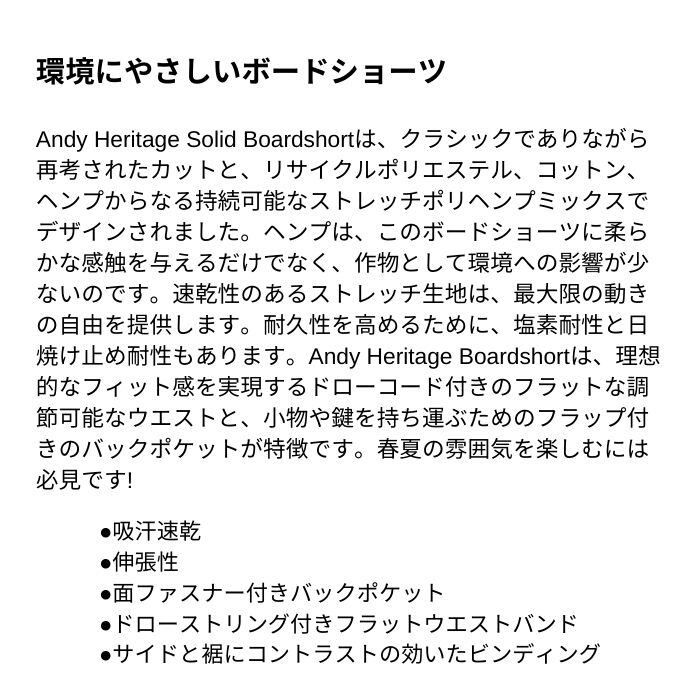 Andy Heritage Solid Boardshortは、クラシックでありながら再考されたカットと、リサイクルポリエステル、コットン、ヘンプからなる持続可能なストレッチポリヘンプミックスでデザインされました。ヘンプは、このボードショーツに柔らかな感触を与えるだけでなく、作物として環境への影響が少ないのです。速乾性のあるストレッチ生地は、最大限の動きの自由を提供します。耐久性を高めるために、塩素耐性と日焼け止め耐性もあります。Andy Heritage Boardshortは、理想的なフィット感を実現するドローコード付きのフラットな調節可能なウエストと、小物や鍵を持ち運ぶためのフラップ付きのバックポケットが特徴です。春夏の雰囲気を楽しむには必見です!