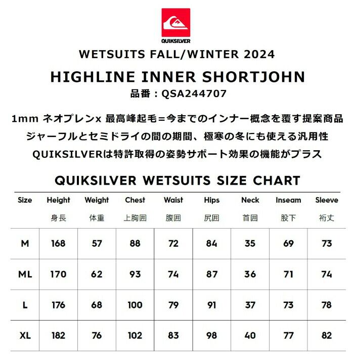 QUIKSILVER クイックシルバー HIGHLINE INNER SHORTJOHN QSA244707 インナー ショートジョン 1mm ネオプレン 特許取得姿勢サポート機能 遠赤外線蓄熱保温機能 正規品