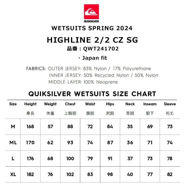 QUIKSILVERクイックシルバー HIGHLINE 2/2 CZ SG QWT241702 ウェットスーツ チェストジップ シーガルスーツ 最上位モデル JapanFiT AQUAα サーフィン 正規品