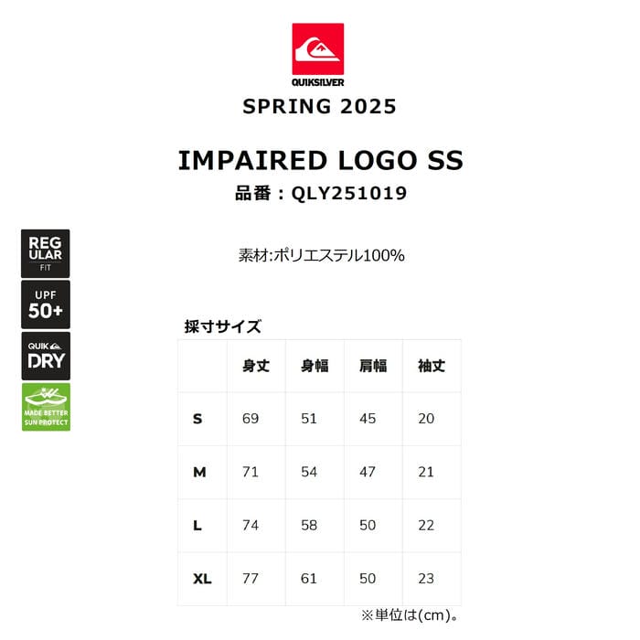 概要 快適性の高い素材を使用した半袖ラッシュガード。透けにくく、ハリ・コシと軽い着心地を両立した生地感が特徴。最高値UPF50+で紫外線から肌を守ります。左胸にボックスロゴ、背中にQUIKSILVERのヘリテージを象徴するロゴグラフィック大きくプリントしたデザインです。シルエットは汎用性の高いレギュラーフィット。