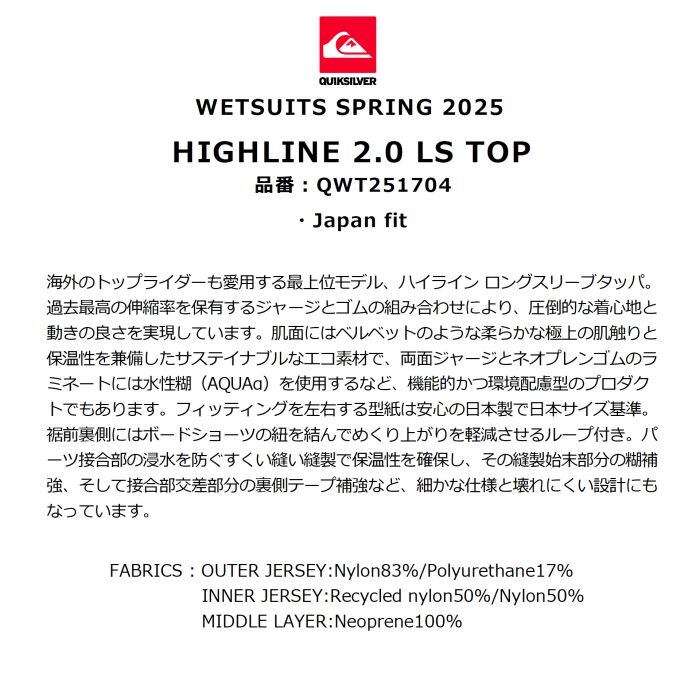 QUIKSILVER HIGHLINE 2.0 LS TOP QWT251704 ロングスリーブタッパ 2mm ループ付き ウェットスーツ 最上位モデル ジャパンフィット ロゴ クイックシルバー 正規品