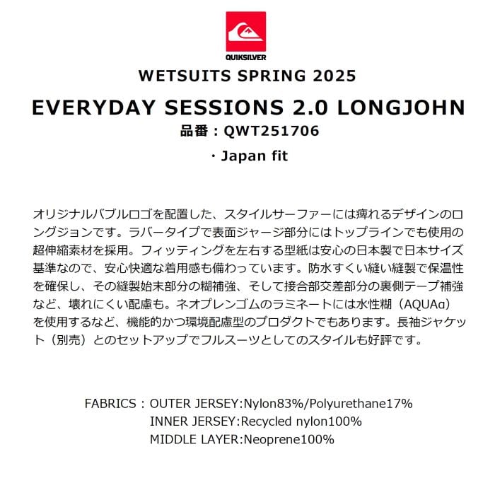 QUIKSILVER EVERYDAY SESSIONS 2.0 LONGJOHN QWT251706 ロングジョン 2mm ラバータイプ ノースリーブ ウェットスーツ ジャパンフィット クイックシルバー 正規品