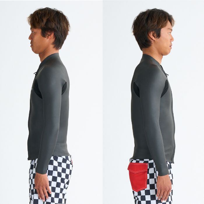フロントジップタイプでオリジナルバブルロゴを配置したスタイルサーファーには痺れるデザインのジャケット。型紙は安心の日本製で日本サイズ基準なので、安心快適な着用感も備わっています。防水すくい縫い縫製で保温性を確保し、接合部交差部分の裏側テープ補強、そしてジッパーフラップ内側下にはめくれ上がりを軽減するボードショーツの紐と括り付けるループ付きで、壊れにくく細かな仕様の設計に。ネオプレンゴムのラミネートには水性糊(AQUAα)を使用するなど、機能的かつ環境配慮型のプロダクトでもあります。ロングジョン(別売)とのセットアップで、フルスーツとしてのスタイルも好評です。