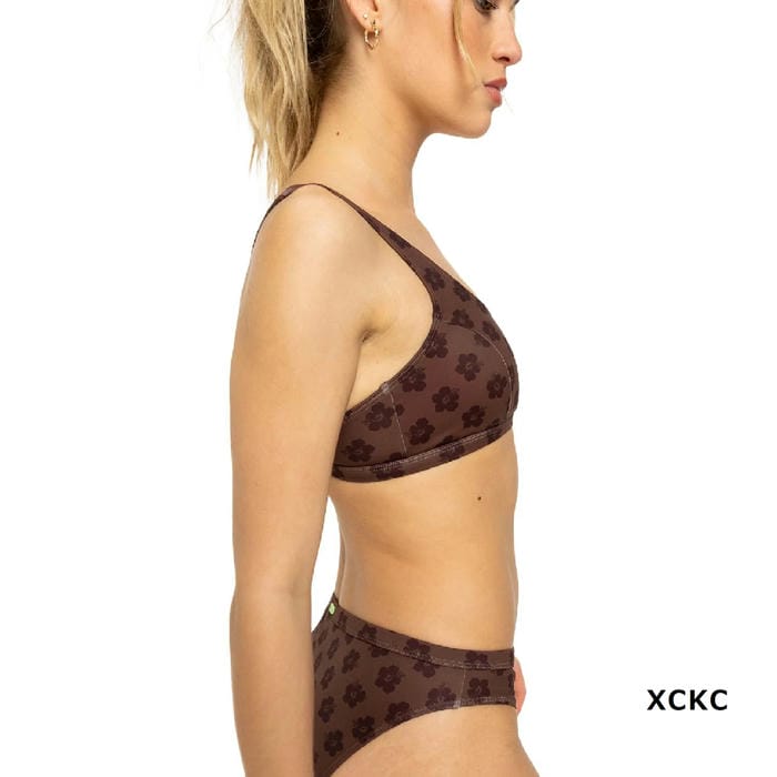 概要 ROXYの世界のトッププロサーファー達とサーフするのにベストなシルエットを追及した、PRO SURFコレクション。ブラウンを基調としたハイビスカスの総柄とホワイト×ブラウンの小さなハイビスカス柄で仕上げた2色展開のビキニトップ。プルオーバータイプで、アンダーバストはゴムの仕様。ショルダーにはアジャスターをつけたので、サイズ調節ができます。アンダーバストの上には水抜き用にカットワークを配しました。同柄のボトムと合わせて着用するのがおすすめです。バックにROXYロゴをあしらいました。取り外し可能なパッド付。
