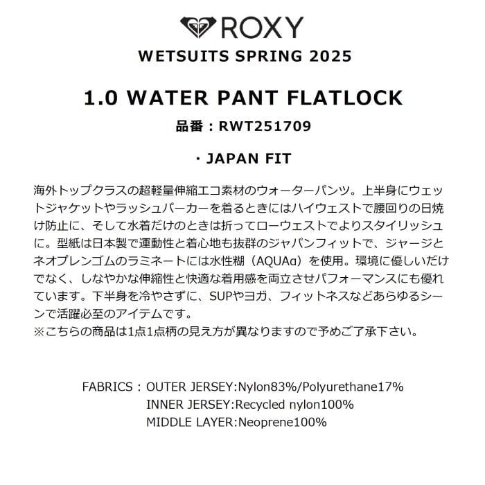 メーカー希望小売価格はメーカーカタログに基づいて掲載しています商品説明モデル名ROXY1.0 WATER PANT FLATLOCK定価:18100+(税)サイズM , ML , LカラーWBS6概要JAPAN FIT海外トップクラスの超軽量伸縮エコ素材のウォーターパンツ。上半身にウェットジャケットやラッシュパーカーを着るときにはハイウェストで腰回りの日焼け防止に、そして水着だけのときは折ってローウェストでよりスタイリッシュに。型紙は日本製で運動性と着心地も抜群のジャパンフィットで、ジャージとネオプレンゴムのラミネートには水性糊(AQUAα)を使用。環境に優しいだけでなく、しなやかな伸縮性と快適な着用感を両立させパフォーマンスにも優れています。下半身を冷やさずに、SUPやヨガ、フィットネスなどあらゆるシーンで活躍必至のアイテムです。※こちらの商品は1点1点柄の見え方が異なりますので予めご了承下さい。素材OUTER JERSEY:Nylon83%/Polyurethane17%INNER JERSEY:Recycled nylon100%MIDDLE LAYER:Neoprene100%※注意事項●返品について●お客様都合によるご注文後の返品・キャンセル・交換は一切受け付けておりませんので、予めご了承下さい。●商品画像について●撮影状況、PC状況により、色合いが若干異なる場合がありますので、ご了承の上ご購入ください。●商品欠品について●掲載されている全ての商品は実店舗・他のネットショッピングでも販売しております。ご注文を承り次第在庫を確保しますが、完売の際はご容赦下さい。 ●送料について●北海道・沖縄・離島等の場合、別途送料が必要となります。