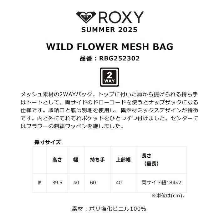 ROXY WILD FLOWER MESH BAG RBG252302 メッシュバッグ 2WAY 肩掛け ナップサック 内/外ポケット ロゴ ワッペン ビーチ プール アウトドア ロキシー 正規品