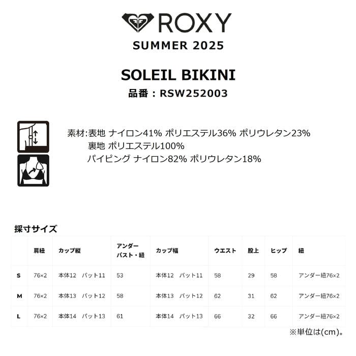 メーカー希望小売価格はメーカーカタログに基づいて掲載しています商品説明モデル名ROXYSOLEIL BIKIN定価:15500+(税)サイズS , M , LカラーBLK , BRN , PIS概要クラシックな幾何学模様のジャガード素材に、水着素材のパイピングをアクセントにしたカバー力のあるバンドゥシルエット。ショルダーから一体になったストラップで肩紐の長さの調節ができます。カップは取り外し可能。ボトムはレトロなハイウエストシルエットで、縦に切り替えラインをいれたことで、スッキリとしたシルエットに見せてくれます。フェミニンな印象で着こなせるスイムウエアです。素材表地 ナイロン41% ポリエステル36% ポリウレタン23%裏地 ポリエステル100%パイピング ナイロン82% ポリウレタン18%※注意事項●返品について●お客様都合によるご注文後の返品・キャンセル・交換は一切受け付けておりませんので、予めご了承下さい。●商品画像について●撮影状況、PC状況により、色合いが若干異なる場合がありますので、ご了承の上ご購入ください。●商品欠品について●掲載されている全ての商品は実店舗・他のネットショッピングでも販売しております。ご注文を承り次第在庫を確保しますが、完売の際はご容赦下さい。 ●送料について●北海道・沖縄・離島等の場合、別途送料が必要となります。