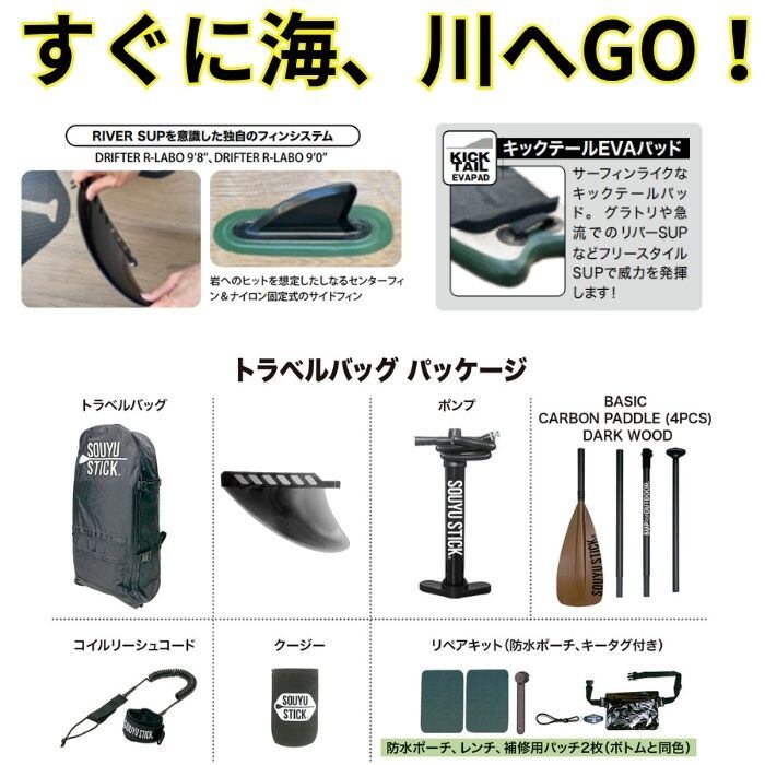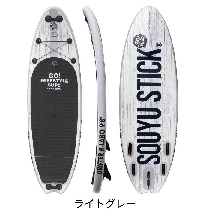 メーカー希望小売価格はメーカーカタログに基づいて掲載しています商品説明モデル名SOUYUSTICKDRIFTER R-LABO 9'8”定価:158000+(税)サイズ9'8カラーライトグレー商品説明フリースタイルリバーSUPのパイオニア平間’RAMA’和徳と、彼が主宰するR-LABOとのコラボレーションにより生まれた「DRIFTER R-LABO 9’8”」がニューカラーで登場。シャープなノーズからフィッシュテールのアウトラインデザインとインフレータブル SUPではあまり見ない強烈なロッカー、4つのサイドフィンは固定式を採用するなど、フリースタイルでSUPを漕ぐ !という漕遊人に向けたスペシャル限定ボードです。GO! FREESTYLE SUP!!SPEC長さ..........2,950mm /9’8”幅 .............870mm /34”厚さ..........120mm /5”容量 .............約240L推奨体重 ......約100kgまでフィン ....... センターフィン(AIR7FIN 4.6インチ黒)サイドフィン(ナイロン固定式HI-352)パッド .......EVA Diamond Black※注意事項●返品について●お客様都合によるご注文後の返品・キャンセル・交換は一切受け付けておりませんので、予めご了承下さい。●商品画像について●撮影状況、PC状況により、色合いが若干異なる場合がありますので、ご了承の上ご購入ください。●商品欠品について●掲載されている全ての商品は実店舗・他のネットショッピングでも販売しております。ご注文を承り次第在庫を確保しますが、完売の際はご容赦下さい。 ●送料について●北海道・沖縄・離島等の場合、別途送料が必要となります。