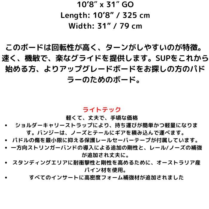 メーカー希望小売価格はメーカーカタログに基づいて掲載しています商品説明モデル名STARBOARDGO LITE TECH 10'8" X 31"定価:186000+(税)サイズ10'8"モデルGO_LITETECH詳細GO全てのパドラーをプロ気分にさせてくれるフレンドリーなファンボード初めてでも水に濡れずに速くパドルしたい。そんなパドラーのための完璧な入門ボードです。比類なき安定性、スピード、そしてグライドの可能性を実現するためボトムに施された大きなコンケーブとボキシーレールを備えた、先進的で用途の広いシェイプ。サイズは長さ 12’0” から 10’2” の範囲で、どんなパドラーの体重と能力にも対応します。大きなサイズはより広いアウトラインから最も高い安定性を提供し、短く狭いボードは、より高いトラッキングとマニューバビリティを提供するので、より軽いライダーに適しています。GOはフラットウォーターで、または軽いチョップで、最高のSUP体験をあなたに提供します。★ライトテック軽くて、丈夫で、手頃な価格ショルダーキャリーストラップにより、持ち運びが簡単かつ軽量になります。バンジーは、ノーズとテールにギアを積み込んで運べます。パドルの傷を最小限に抑える保護レールセーバーテープが付属しています。一方向ストリンガーバンドの導入による追加の剛性と、レール/ノーズの補強が追加され丈夫に。スタンディングエリアに耐衝撃性と剛性を高めるために、オーストラリア産パイン材を使用。すべてのインサートに高密度フォーム補強材が追加されました。スペック10’8″ x 31″ GOLength: 10’8” / 325 cmWidth: 31” / 79 cmこのボードは回転性が高く、ターンがしやすいのが特徴。速く、機敏で、楽なグライドを提供します。SUPをこれから始める方、よりアップグレードボードをお探しの方のパドラーのためのボード。※注意事項●返品について●お客様都合によるご注文後の返品・キャンセル・交換は一切受け付けておりませんので、予めご了承下さい。●商品画像について●撮影状況、PC状況により、色合いが若干異なる場合がありますので、ご了承の上ご購入ください。●商品欠品について●掲載されている全ての商品は実店舗・他のネットショッピングでも販売しております。ご注文を承り次第在庫を確保しますが、完売の際はご容赦下さい。 ●送料について●北海道・沖縄・離島等の場合、別途送料が必要となります。