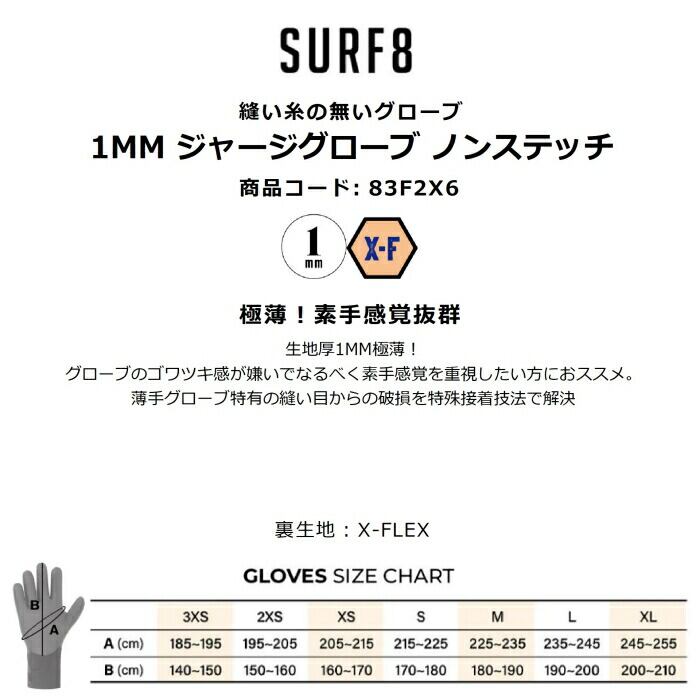 SURF8 サーフエイト 1MM ジャージグローブ ノンステッチ 83F2X6 素手感覚 超伸縮 X-FLEX 縫い糸がない 特殊接着技法 手の平プリント 極薄 サーフィン 正規品