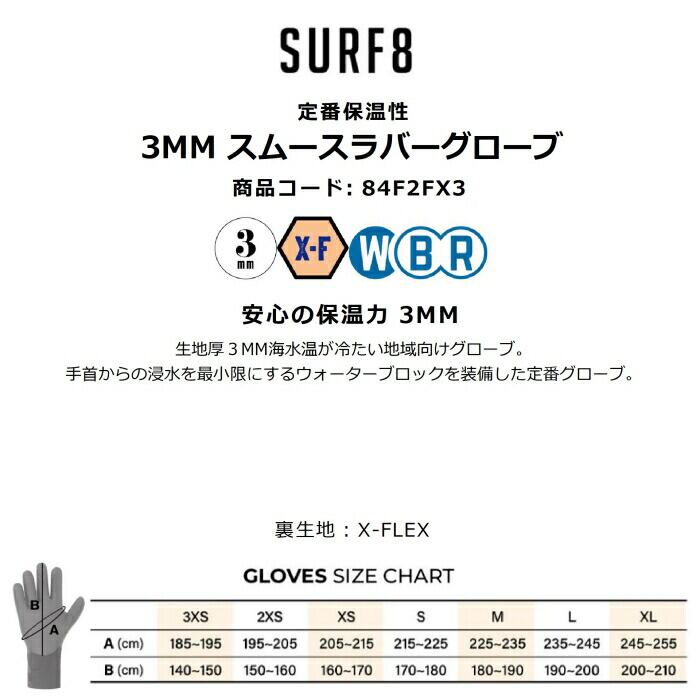SURF8 サーフエイト 3MM スムースラバーグローブ 84F2FX3 定番保温性 X-FLEX裏地 ウォーターブロック 浸水軽減 保温 海水温が冷たい地域向け サーフィン 正規品