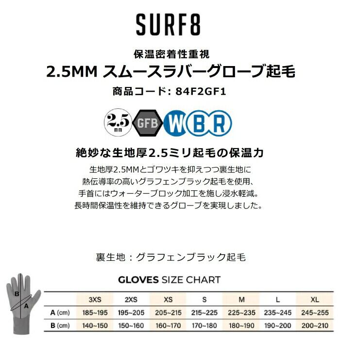SURF8 サーフエイト 2.5MM スムースラバーグローブ起毛 84F2GF1 保温密着性重視 グラフェンブラック起毛 ウォーターブロック 浸水軽減 保温 サーフィン 正規品