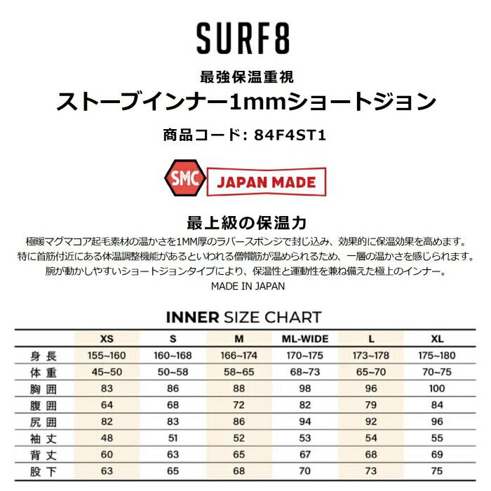 SURF8 サーフエイト ストーブインナー1mmショートジョン 84F4ST1 M-XL 極暖マグマコア起毛裏地 保温効果 ノースリーブ ひざ上丈 国産 サーフィン 正規品