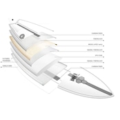 X-Liteのデッキ部分には衝撃保護メッシュによる更なる多重構造化で衝撃によるインパクトを分散し、くぼみやへこみ等を最小化する設計となっています。ボトム部分ではカーボンストリップによりフレキシビリティーとクイックなレスポンスを実現。