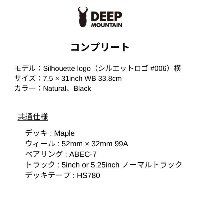 メーカー希望小売価格はメーカーカタログに基づいて掲載しています商品説明モデル名DEEP MOUNTAINSilhouette logo(シルエットロゴ #006)横定価:9090+(税)サイズ7.5×31inch×WB33.8cmカラーNatural , Black詳細【共通仕様】デッキ : Mapleウィール : 52mm × 32mm 99Aベアリング : ABEC-7トラック : 5inch or 5.25inch ノーマルトラックデッキテープ : HS780※注意事項●返品について●お客様都合によるご注文後の返品・キャンセル・交換は一切受け付けておりませんので、予めご了承下さい。●商品画像について●撮影状況、PC状況により、色合いが若干異なる場合がありますので、ご了承の上ご購入ください。●商品欠品について●掲載されている全ての商品は実店舗・他のネットショッピングでも販売しております。ご注文を承り次第在庫を確保しますが、完売の際はご容赦下さい。 ●送料について●北海道・沖縄・離島等の場合、別途送料が必要となります。