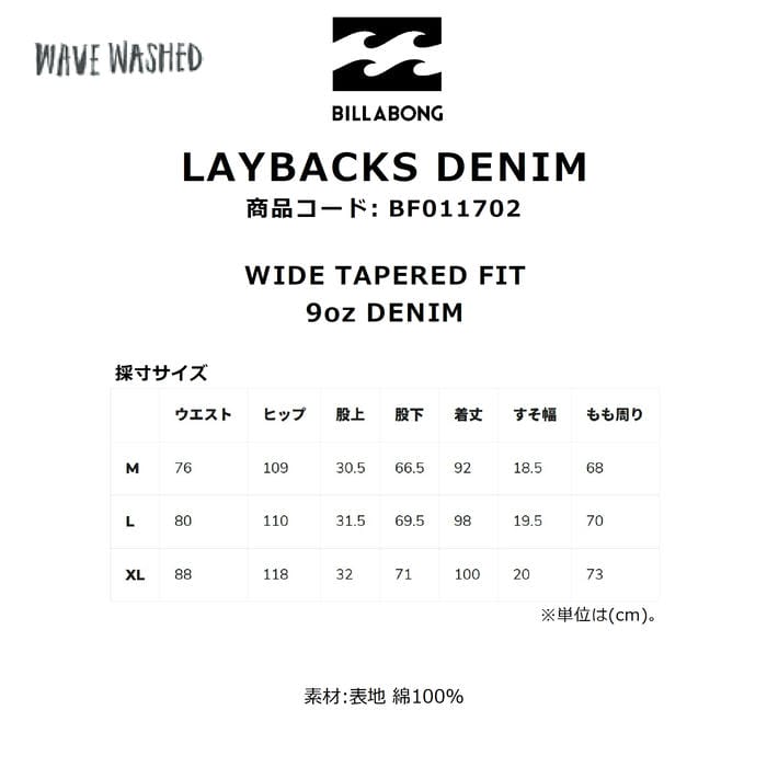 メーカー希望小売価格はメーカーカタログに基づいて掲載しています商品説明モデル名BILLABONGLAYBACKS DENIM定価:9500+(税)サイズM , L , XLカラーBLU , IND概要今季からスタートしたINDIGO COLLECTIONのデニムパンツ。長年履き込んだようなアタリや色落ち、ヒゲを表現した生地感が魅力。ヒップや太ももにゆとりを持たせ、裾にかけて徐々に細くなるワイドテーパードシルエットを採用。ウエストはゴム&内側のドローコードで簡単に調整可能。ワイドながらコーディネートのバランスが決まるサイズ感です。素材表地 綿100%※注意事項●返品について●お客様都合によるご注文後の返品・キャンセル・交換は一切受け付けておりませんので、予めご了承下さい。●商品画像について●撮影状況、PC状況により、色合いが若干異なる場合がありますので、ご了承の上ご購入ください。●商品欠品について●掲載されている全ての商品は実店舗・他のネットショッピングでも販売しております。ご注文を承り次第在庫を確保しますが、完売の際はご容赦下さい。 ●送料について●北海道・沖縄・離島等の場合、別途送料が必要となります。