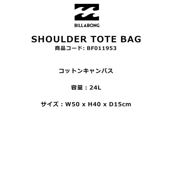 メーカー希望小売価格はメーカーカタログに基づいて掲載しています商品説明モデル名BILLABONGSHOULDER TOTE BAG定価:4400+(税)サイズFカラーOFW , WAA素材コットンキャンバスサイズW50 x H40 x D15cm容量:24L※注意事項●返品について●お客様都合によるご注文後の返品・キャンセル・交換は一切受け付けておりませんので、予めご了承下さい。●商品画像について●撮影状況、PC状況により、色合いが若干異なる場合がありますので、ご了承の上ご購入ください。●商品欠品について●掲載されている全ての商品は実店舗・他のネットショッピングでも販売しております。ご注文を承り次第在庫を確保しますが、完売の際はご容赦下さい。 ●送料について●北海道・沖縄・離島等の場合、別途送料が必要となります。