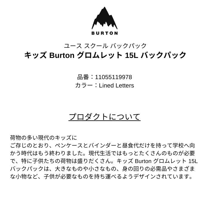メーカー希望小売価格はメーカーカタログに基づいて掲載しています商品説明モデル名BURTONキッズ Burton グロムレット 15L バックパック定価:4500+(税)サイズO/SカラーLinedLetters概要荷物の多い現代のキッズにご存じのとおり、ペンケースとバインダーと昼食代だけを持って学校へ向かう時代はもう終わりました。現代生活ではもっとたくさんのものが必要で、特に子供たちの荷物は盛りだくさん。キッズ Burton グロムレット 15L バックパックは、大きなものや小さなもの、身の回りの必需品やさまざまな小物など、子供が必要なものを持ち運べるようデザインされています。詳細・ハイテク対応便利な機能を満載したバックパックにポケットとタブレット収納スペースが付いて、ますます使いやすくなりました。・環境への影響を軽減bluesign?の認証を受けた素材は、安全な化学薬品のみを使用し、製造工程における資源の保全、消費者や製造者の安全、空気と排水の清潔さなどの最高基準をクリアしています。スペック・寸法:15in x 10in x 5in、39cm x 26cm x 12cm・重量:0.9lbs / 0.41kg・容量:15L・推奨する使用法:エブリデイ、スクール・特性と機能:胸部ストラップ、人間工学的ショルダーストラップ、両サイドのメッシュボトルポケット、ネームタグ付きIDウインドウ、キッズの小さな手でも簡単に扱えるバックル、外側の複数のアクセサリーポケット・素材:C0撥水加工と裏地にPU加工を施したbluesign?認証600Dリサイクルポリエステル・保証:ライフタイムワランティ対象※注意事項●返品について●お客様都合によるご注文後の返品・キャンセル・交換は一切受け付けておりませんので、予めご了承下さい。●商品画像について●撮影状況、PC状況により、色合いが若干異なる場合がありますので、ご了承の上ご購入ください。●商品欠品について●掲載されている全ての商品は実店舗・他のネットショッピングでも販売しております。ご注文を承り次第在庫を確保しますが、完売の際はご容赦下さい。 ●送料について●北海道・沖縄・離島等の場合、別途送料が必要となります。