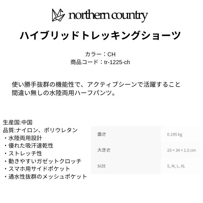 メーカー希望小売価格はメーカーカタログに基づいて掲載しています商品説明モデル名northern countryUNISEX HYBRID TREKKING SHORTS定価:3600+(税)サイズS , M , L , XLカラーCH詳細使い勝手抜群の機能性で、アクティブシーンで活躍すること間違い無しの水陸両用ハーフパンツ。特長生産国:中国品質:ナイロン、ポリウレタン・水陸両用設計・優れた吸汗速乾性・ストレッチ性・動きやすいガゼットクロッチ・スマホ用サイドポケット・通水性抜群のメッシュポケット※注意事項●返品について●お客様都合によるご注文後の返品・キャンセル・交換は一切受け付けておりませんので、予めご了承下さい。●商品画像について●撮影状況、PC状況により、色合いが若干異なる場合がありますので、ご了承の上ご購入ください。●商品欠品について●掲載されている全ての商品は実店舗・他のネットショッピングでも販売しております。ご注文を承り次第在庫を確保しますが、完売の際はご容赦下さい。 ●送料について●北海道・沖縄・離島等の場合、別途送料が必要となります。