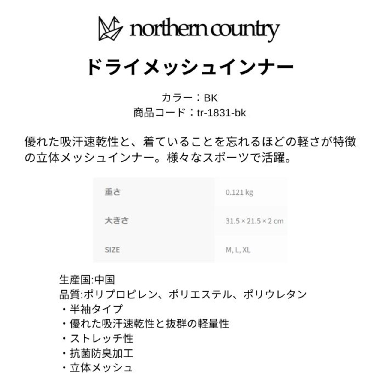 メーカー希望小売価格はメーカーカタログに基づいて掲載しています商品説明モデル名northern countryDRY MESH INNER SHIRT(SHORT)定価:2700+(税)サイズM , L , XLカラーBK詳細優れた吸汗速乾性と、着ていることを忘れるほどの軽さが特徴の立体メッシュインナー。様々なスポーツで活躍。特長生産国:中国品質:ポリプロピレン、ポリエステル、ポリウレタン・半袖タイプ・優れた吸汗速乾性と抜群の軽量性・ストレッチ性・抗菌防臭加工・立体メッシュ※注意事項●返品について●お客様都合によるご注文後の返品・キャンセル・交換は一切受け付けておりませんので、予めご了承下さい。●商品画像について●撮影状況、PC状況により、色合いが若干異なる場合がありますので、ご了承の上ご購入ください。●商品欠品について●掲載されている全ての商品は実店舗・他のネットショッピングでも販売しております。ご注文を承り次第在庫を確保しますが、完売の際はご容赦下さい。 ●送料について●北海道・沖縄・離島等の場合、別途送料が必要となります。