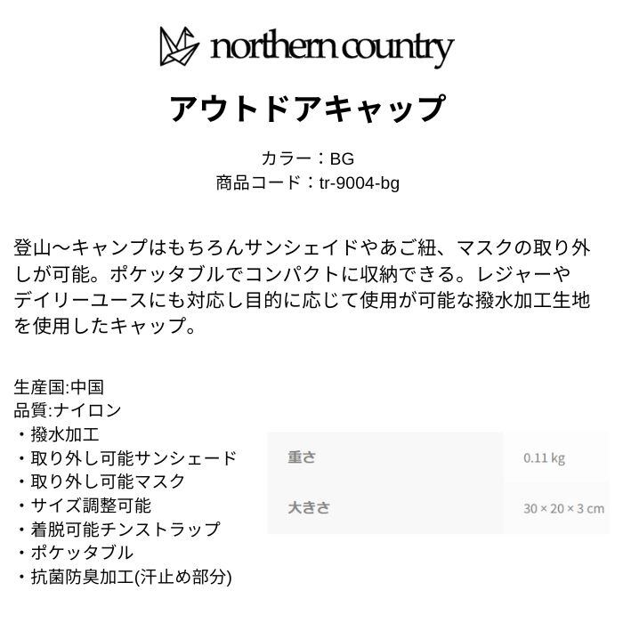 メーカー希望小売価格はメーカーカタログに基づいて掲載しています商品説明モデル名northern countryOUTDOOR CAP(撥水生地使用)定価:3600+(税)サイズFREE(56-59.5cm)カラーBG詳細登山〜キャンプはもちろんサンシェイドやあご紐、マスクの取り外しが可能。ポケッタブルでコンパクトに収納できる。レジャーやデイリーユースにも対応し目的に応じて使用が可能な撥水加工生地を使用したキャップ。特長生産国:中国品質:ナイロン・撥水加工・取り外し可能サンシェード・取り外し可能マスク・サイズ調整可能・着脱可能チンストラップ・ポケッタブル・抗菌防臭加工(汗止め部分)※注意事項●返品について●お客様都合によるご注文後の返品・キャンセル・交換は一切受け付けておりませんので、予めご了承下さい。●商品画像について●撮影状況、PC状況により、色合いが若干異なる場合がありますので、ご了承の上ご購入ください。●商品欠品について●掲載されている全ての商品は実店舗・他のネットショッピングでも販売しております。ご注文を承り次第在庫を確保しますが、完売の際はご容赦下さい。 ●送料について●北海道・沖縄・離島等の場合、別途送料が必要となります。