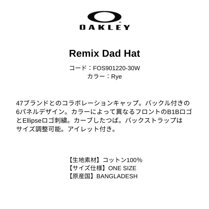 OAKLEY オークリー REMIX DAD HAT FOS901220-30W RYE 6パネルデザイン バックストラップ ロゴ 刺繍 キャップ 帽子 正規品